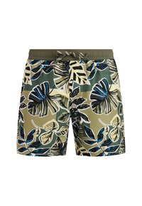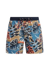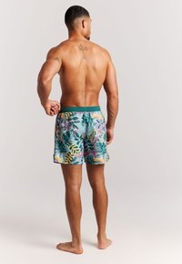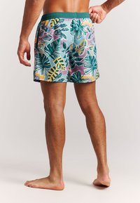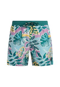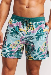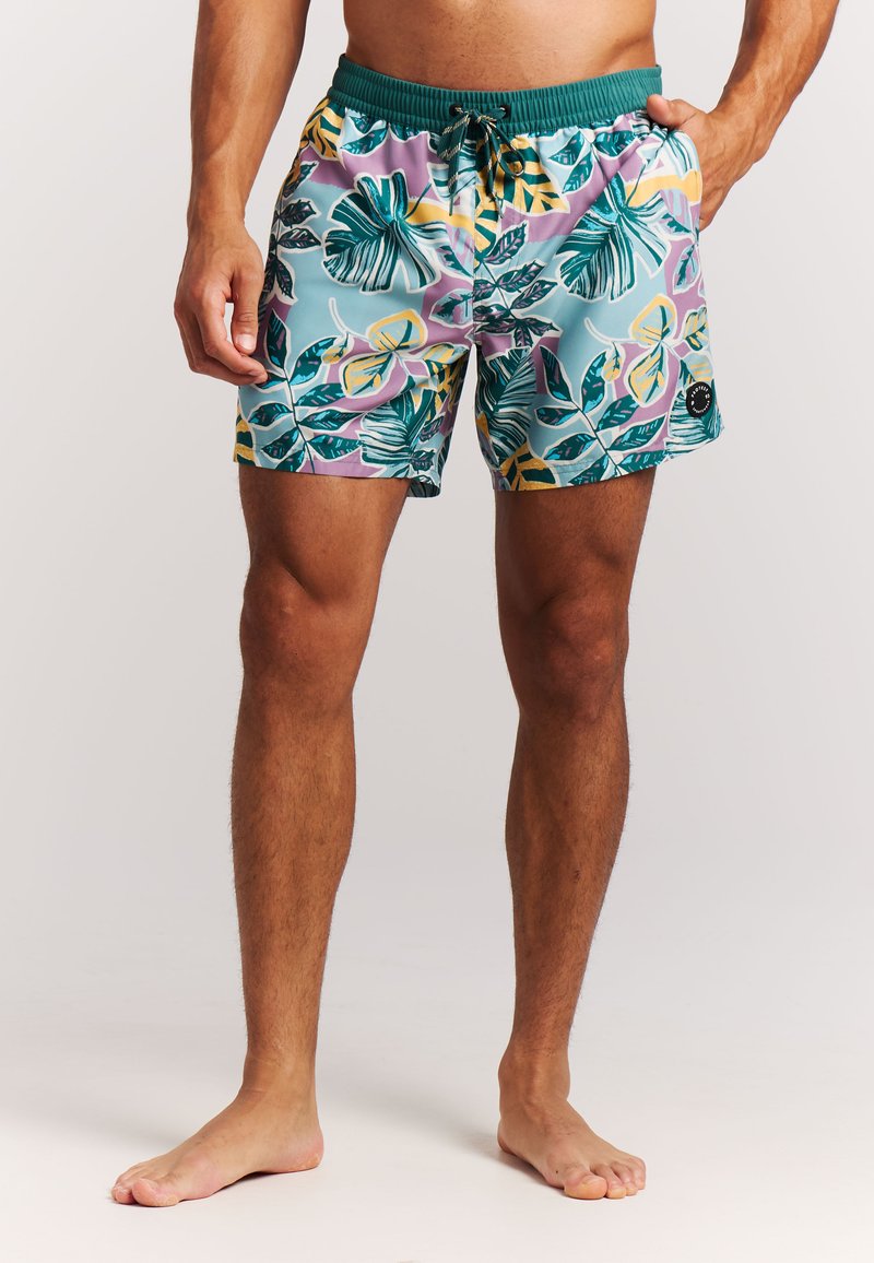 Zwembroek met een tropisch bloemenpatroon in teal, paars en geel, voorzien van een elastische tailleband en trekkoorddetail.