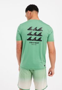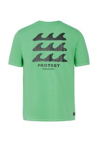 Groene t-shirt met korte mouwen, voorzien van een zwarte golfafbeelding op de achterkant, gemaakt van lichtgewicht materiaal met een soepele textuur.
