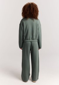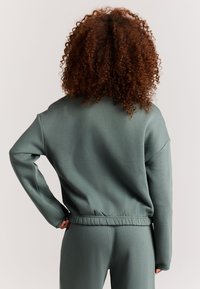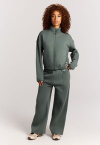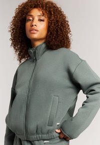 Vrouw met krullend haar die een grijs-groene hoodie met rits en bijpassende broek draagt, poserend met één hand bij haar kin.