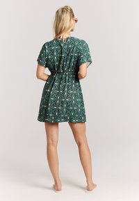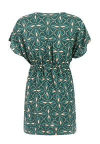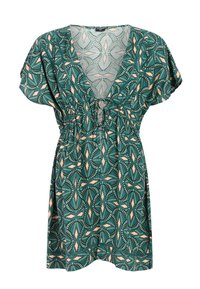 Groen kaftan met patroon en striksluiting, korte mouwen en een diepe V-hals. Het materiaal is lichtgewicht; bevat een mix van abstracte vormen in koraalkleur.