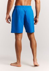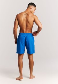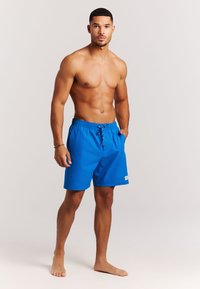 Man draagt felblauwe zwemshort met trekkoord, staat blootsvoets tegen een effen achtergrond en toont voor- en zijaanzicht.