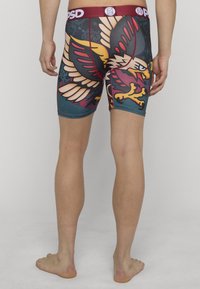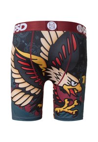 Slanke man draagt meerkleurige boxershorts met een grote adelaarafbeelding en PSD-logo op een bordeauxrode tailleband, staat op blote voeten.