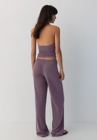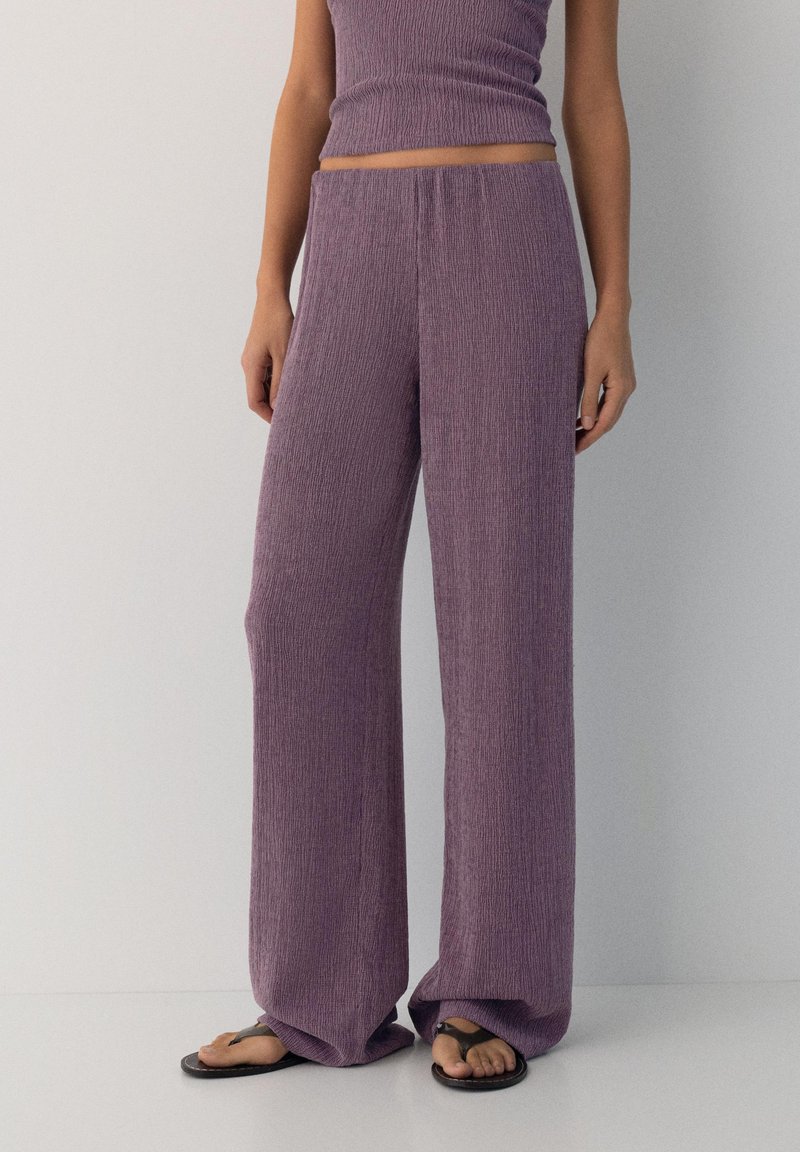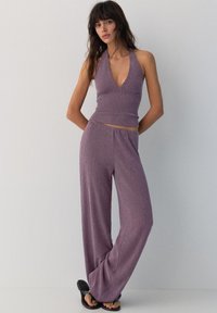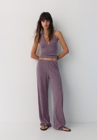 Vrouw draagt hoog getailleerde, wijdvallende lavendelkleurige broek met structuur, gecombineerd met een bijpassend cropped mouwloos topje en zwarte teenslippers.