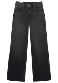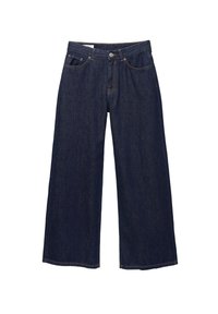 Bruine top met lange mouwen gecombineerd met lichtblauwe jeans met wijde pijpen en een iets rafelige zoom, aangevuld met bruine suède schoenen.