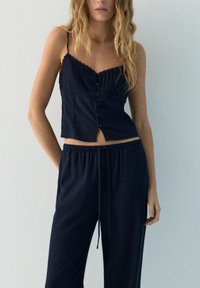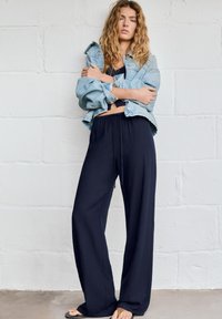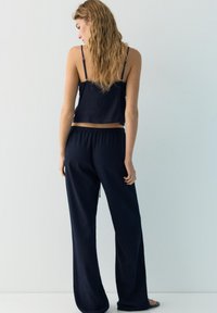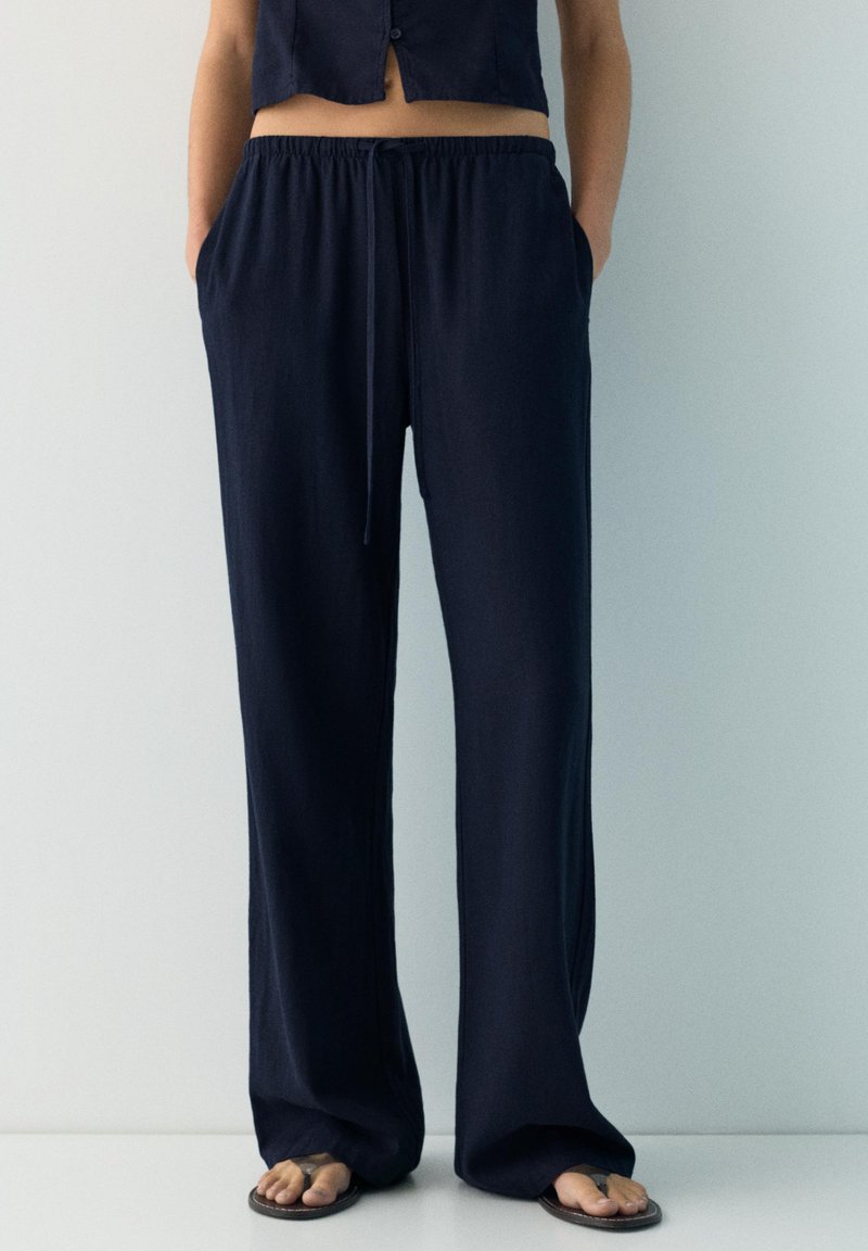 Persoon die losse zwarte broek met trekkoord en zwarte slippers draagt, staand tegen een effen lichte muur met handen in de zakken.