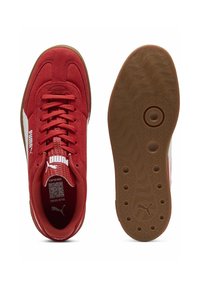 Rode Puma sneaker met witte streep en bruine zool, gezien van de zijkant.
