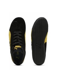 Zwarte Puma-sneaker met gele zijstreep, Puma-logo, zwarte veters en een gestructureerde zwarte zool, zijaanzicht op een witte achtergrond.