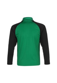 Groene sporttop met lange mouwen en zwarte mouwen, met een ritskraag en een wit merkembleem op de borst. Gemaakt van ademend materiaal.