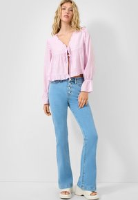 Blonde vrouw met golvend haar die een lichtroze blouse met lange mouwen draagt, voorzien van strikjes aan de voorkant en volantdetails, gecombineerd met een hooggetailleerde blauwe spijkerbroek.
