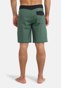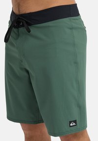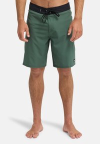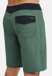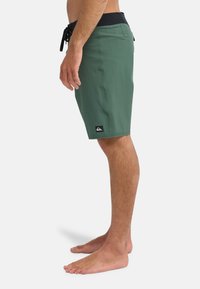 Groene zwembroek met een zwarte tailleband met trekkoord. Gemaakt van glad, lichtgewicht stof. Heeft een klein logo aan de onderkant aan de linkerkant.