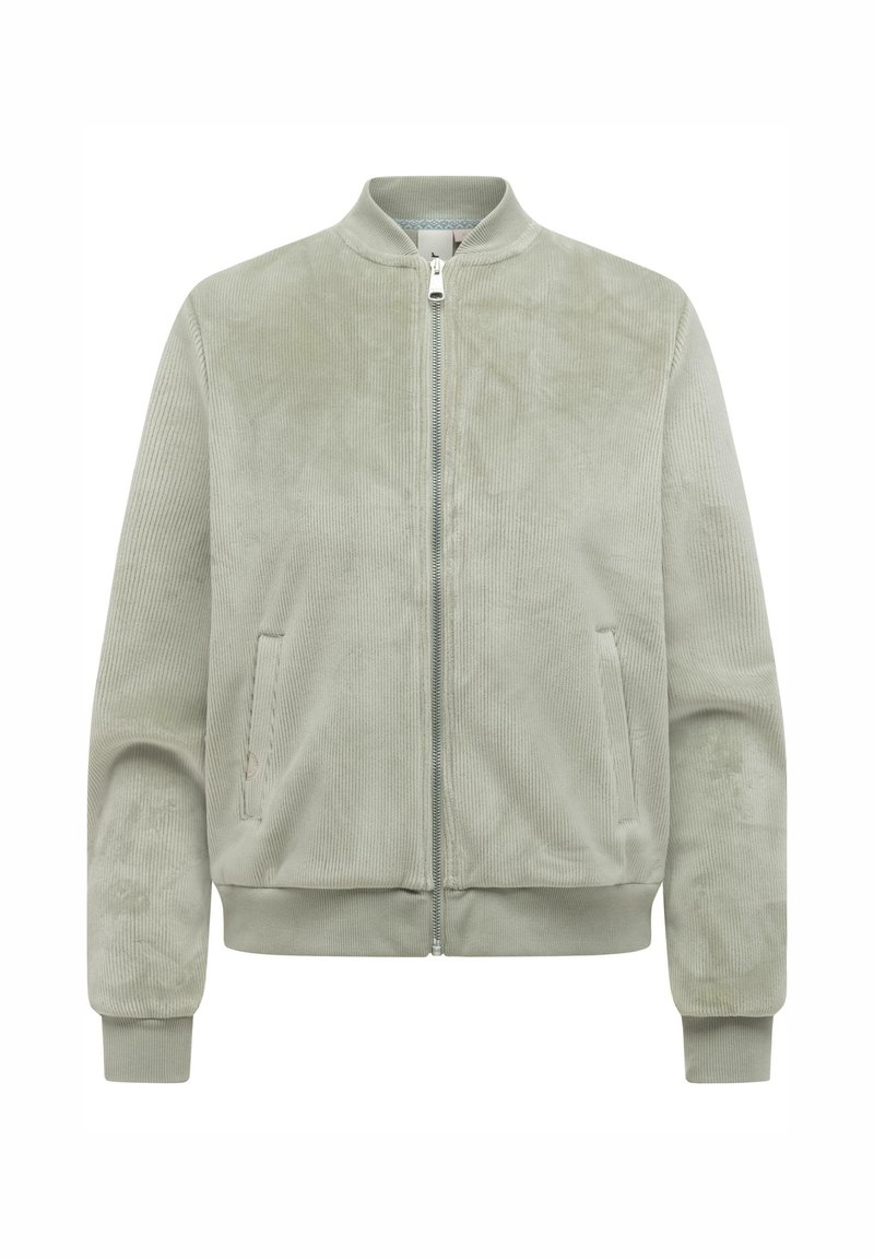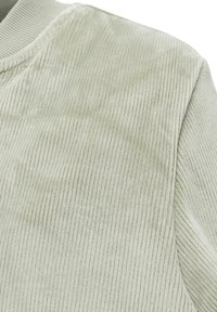 Lichtgroene corduroy bomberjas met ritssluiting aan de voorkant, geribde kraag, manchetten, zoom en twee zijzakken.