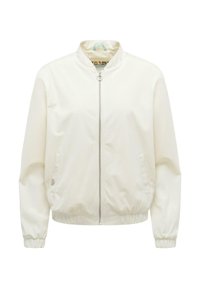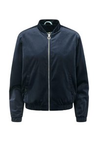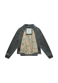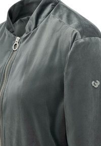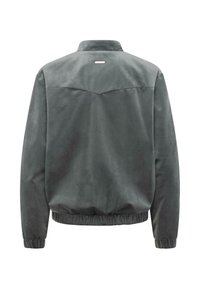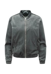 Grijze suède bomberjack met ritssluiting aan de voorkant, geribbelde manchetten en zoom, en twee steekzakken aan de voorkant.