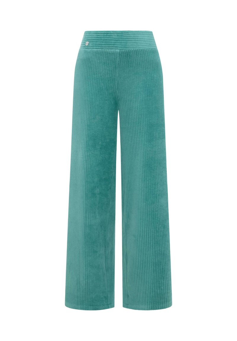 Turkoois groene wijde wijde corduroy broek met hoge tailleband en subtiele verticale geribbelde textuur, vlakke voorkant, geen zichtbare zakken of sluitingen.