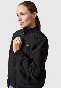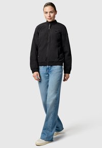 Jonge vrouw die een zwarte bomberjack met rits draagt over een wit shirt en lichtblauwe spijkerbroek, staand tegen een eenvoudige, lichte achtergrond.