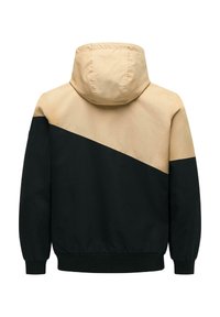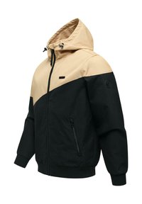 Beige en zwarte capuchonjas met rits en diagonale kleurverdeling, verstelbare koordjes aan de capuchon, zijzakken met rits en geribbelde boorden en zoom.