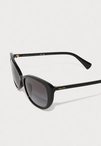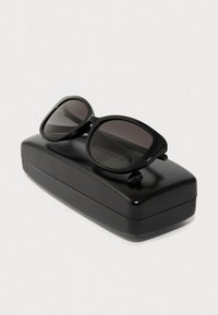 Zwarte zonnebril met een cat-eye ontwerp, gradient lenzen en slanke zwarte tempels met een gouden accent. Gemaakt van plastic materiaal.