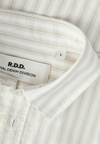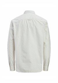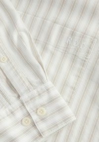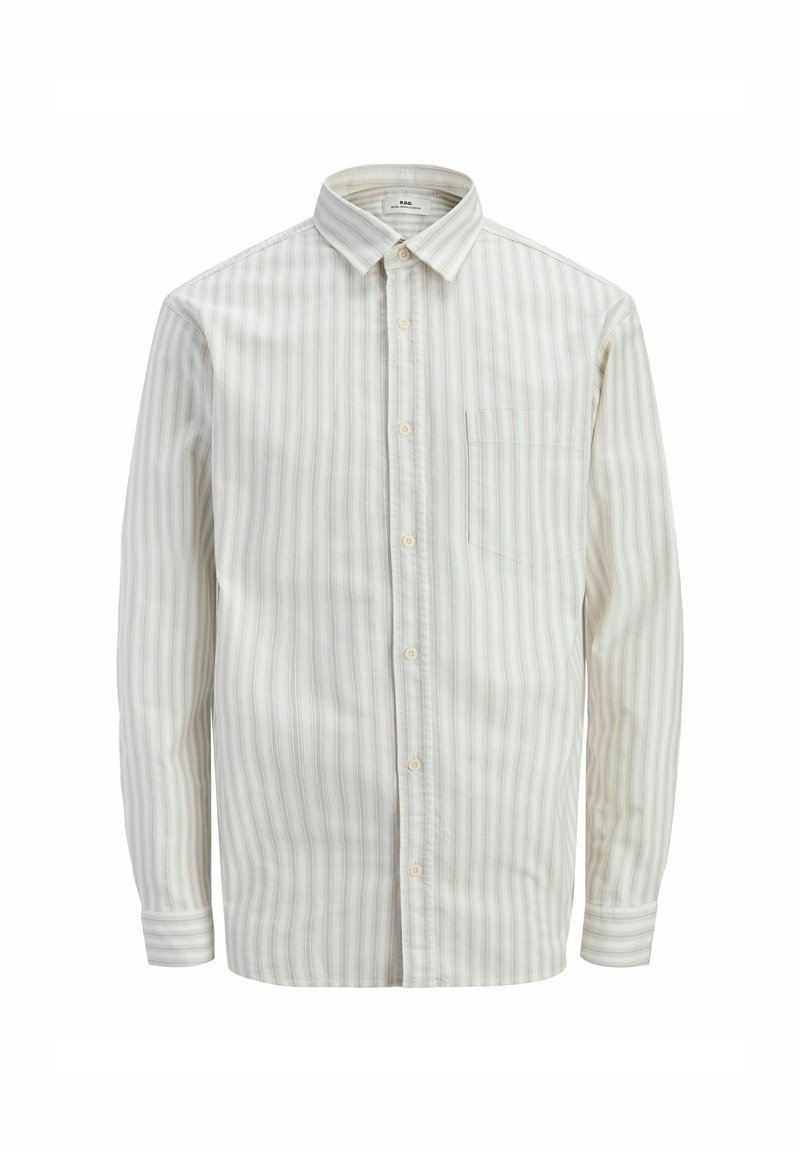 Langarm overhemd met knoopsluiting, lichtgewicht stof, wit met dunne verticale strepen in lichtgrijs en pastelkleuren, enkele borstzak.