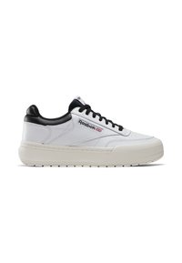 Zwarte leren sneaker met een witte rubberen zool, voorzien van een versterkte neus, gestructureerde zijkanten en een klassiek Reebok-logo op de bovenkant.