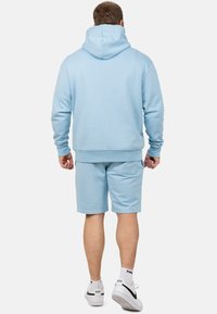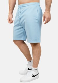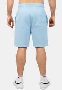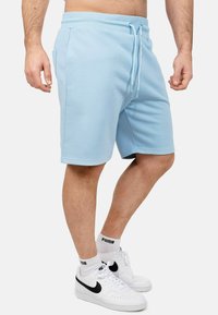 Lichtblauwe katoenen shorts met een elastische tailleband en een trekkoord, voorzien van twee zijzakken en een rechte snit. G gedragen met witte sneakers.