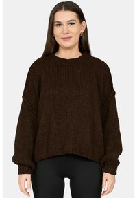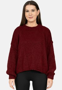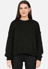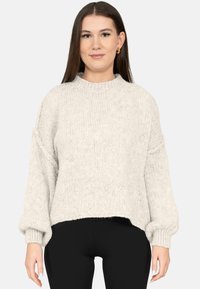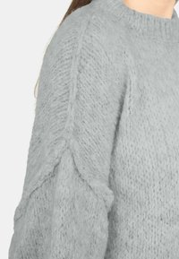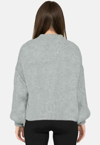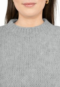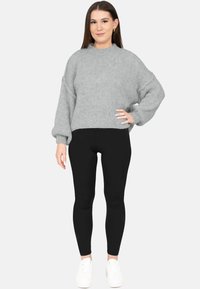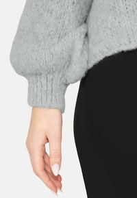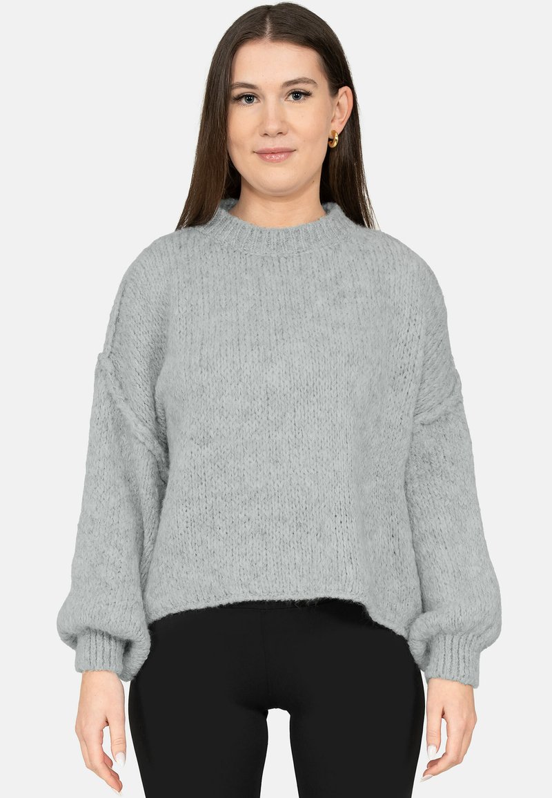 Vrouw die een losse, lichtgrijze gebreide trui met ballonmouwen en een zwarte broek draagt, recht naar voren staand tegen een effen achtergrond.