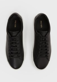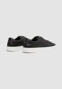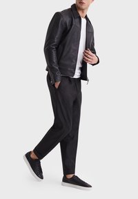 Man die een zwarte leren jas, een wit overhemd, een zwarte broek en zwarte sneakers met witte zolen draagt, lopend met één hand in zijn zak.