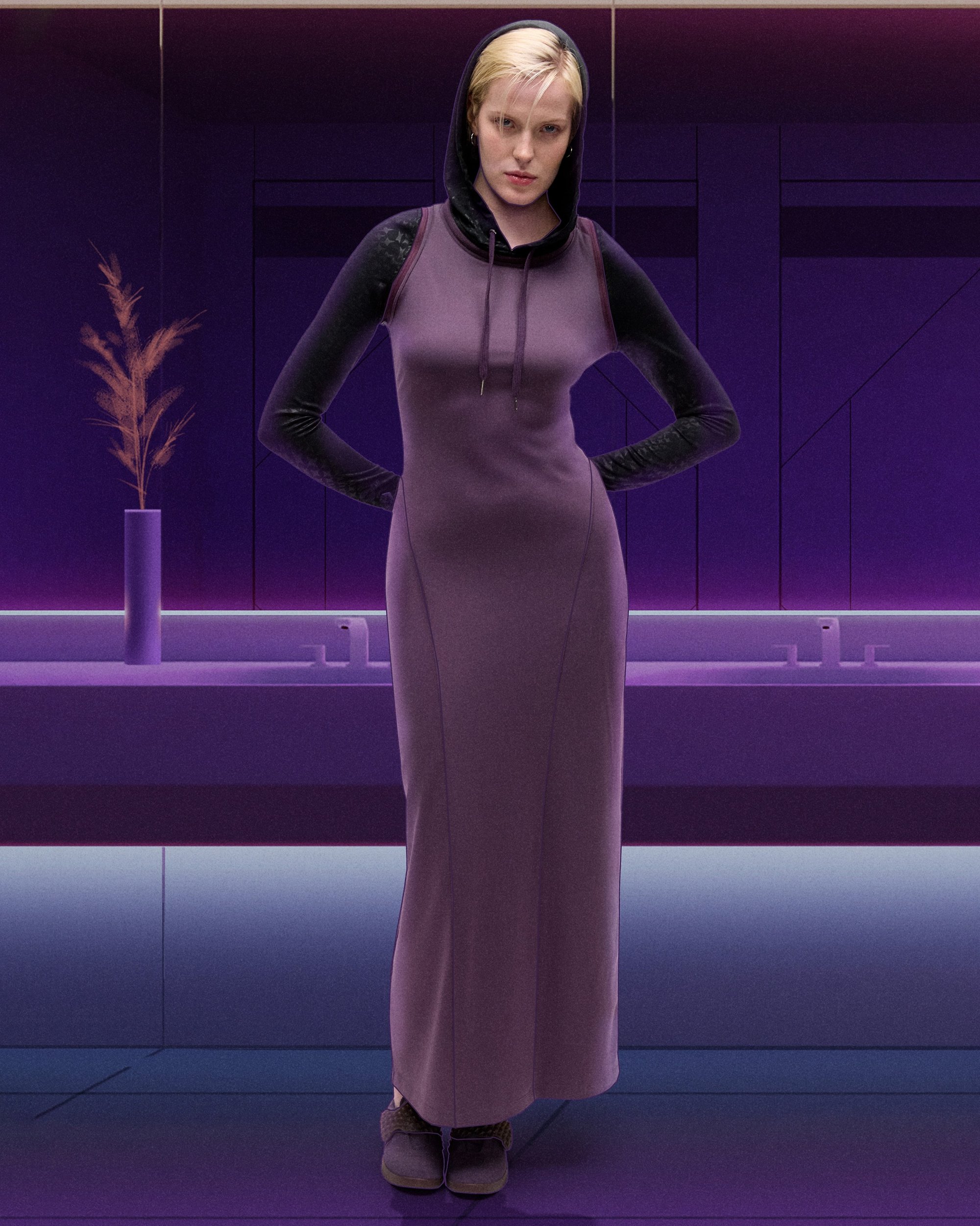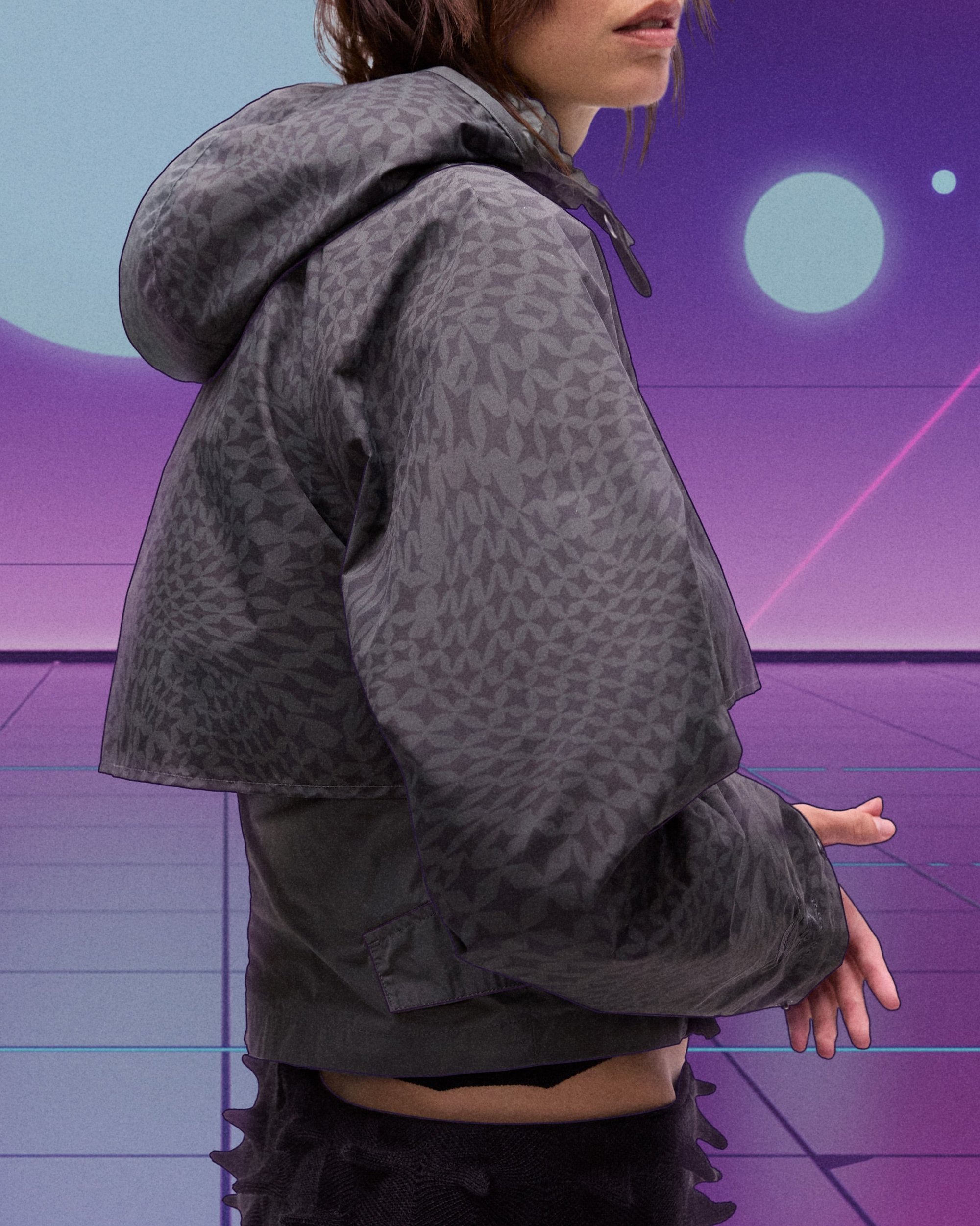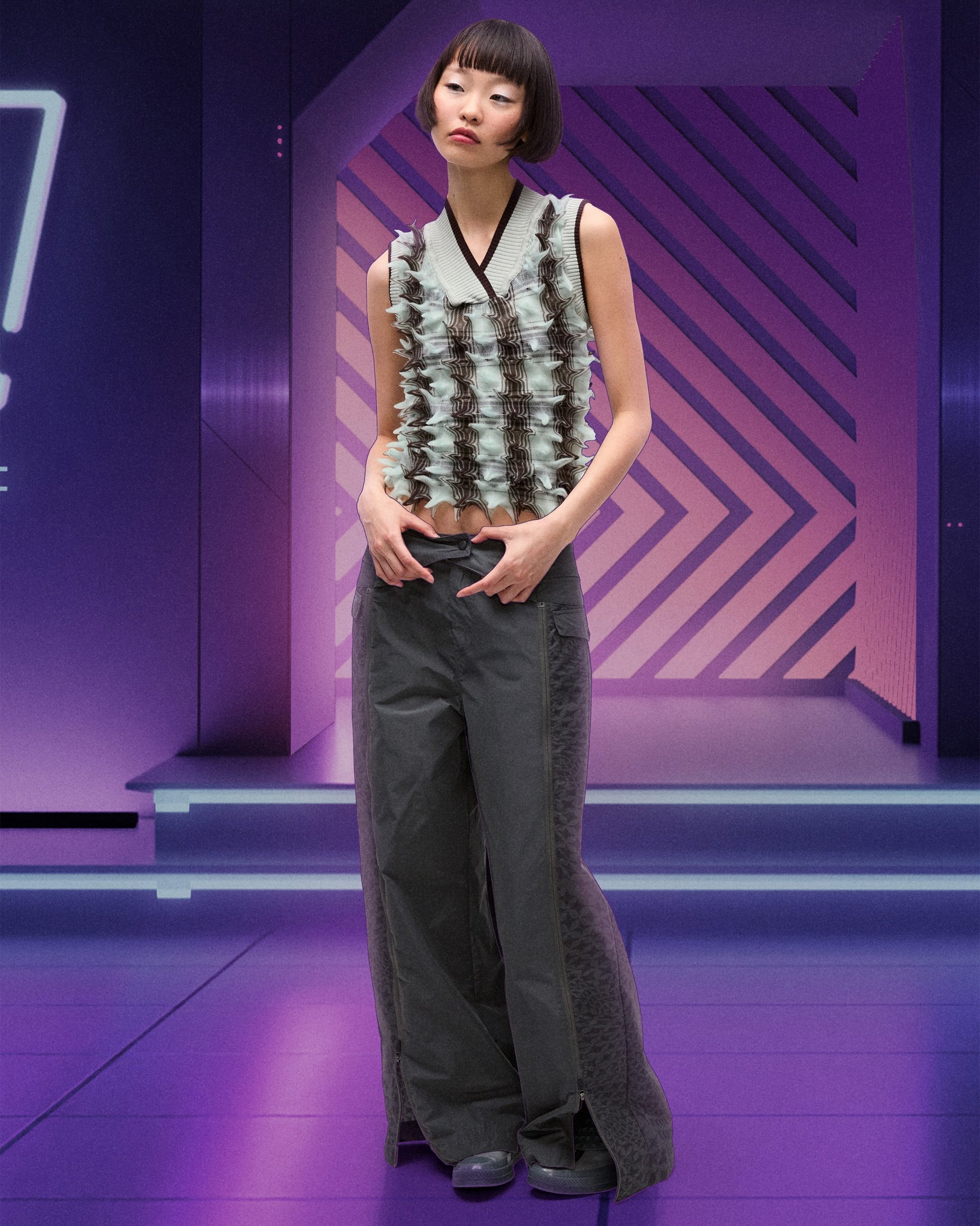De link met anime gaat verder dan het uiterlijk. De essentie van deze collectie is bescherming, kracht en zelfexpressie. “Vroeger droeg ik opvallende kleding als een soort schild”, zegt Lo. Vanuit dezelfde gedachte ontwierp hij deze items als moderne pantsers, met 3D-geprinte spikes. Kenmerkend is de bijna maskerachtige hoodie.