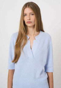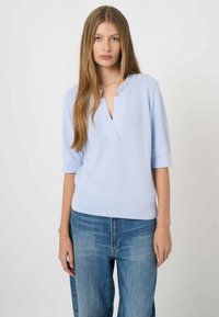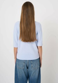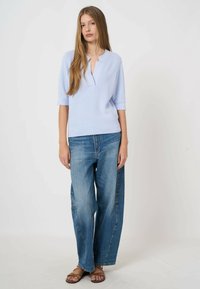 Jonge vrouw met lang steil haar, gekleed in een lichtblauw gebreid topje met een diepe V-hals en een blauwe spijkerbroek, tegen een effen achtergrond.