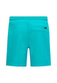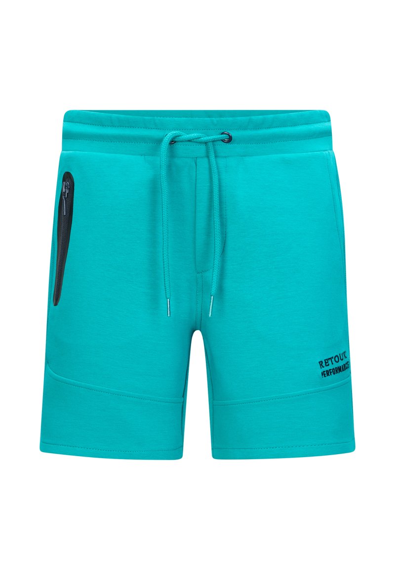 Turquoise sportieve shorts van zacht materiaal met een elastische tailleband, trekkoord en een ritsvak aan de zijkant; met logo-detail.