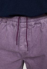 Witte katoenen t-shirt met een zwart graphic op de linkerkant van de borst, gecombineerd met blauwe corduroy shorts, gestreepte sokken en zwarte sneakers.