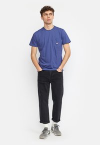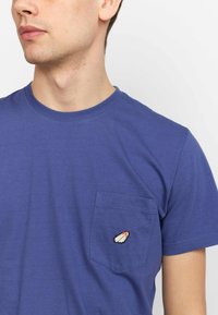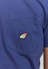 Korte mouwen, blauwe katoenen t-shirt met een ronde hals en een linkerzak met een klein geborduurd ontwerp. Regular fit, gladde textuur.