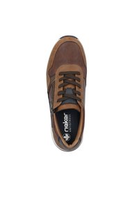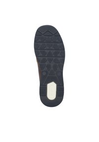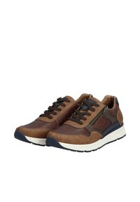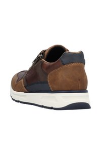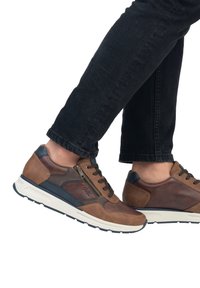 Bruin leren sneaker met een gestructureerde afwerking, vetersluiting, blauwe accenten en een rits aan de zijkant. Rubberen zool; weergegeven op een geknipte broekspijpen.
