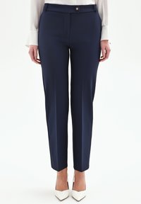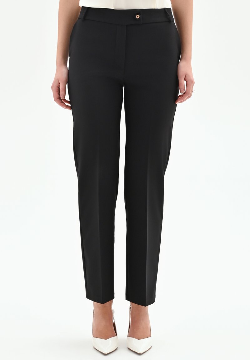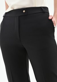 Zwarte, op maat gemaakte broek met een gladde textuur, voorzien van een platte voorkant, tailleband en een klein knoopdetail. Aansluitend silhouet met taps toelopende pijpen.