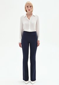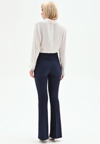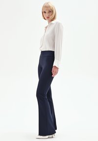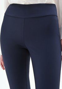 Marineblauwe, nauwsluitende broek met een hoge tailleband, gemaakt van een glad materiaal. De pijpen lopen aan de onderkant iets uit.