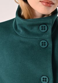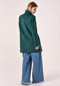 Donkergroene, knielange jas met een hoge kraag en zes knopen, gecombineerd met brede lichtblauwe spijkerbroeken en groene accent schoenen.