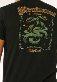 Zwart katoenen t-shirt met korte mouwen, met een groene en gouden slangengrafiek en de tekst "Mentawai" aan de voorkant.