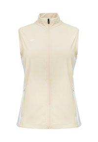 Beige mouwloos vest met ritssluiting aan de voorkant, gecombineerd met lange witte mouwen. Glad stof met een lichte glans. Witte rok met logo bij de zoom.