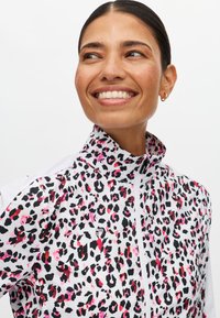 Witte zip-up jas met luipaardprint in roze en zwart, voorzien van lange mouwen en een hoge kraag, gecombineerd met een bordeauxrode rok.
