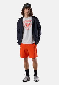 Man draagt een grijs Rossignol T-shirt met rood logo, oranje broek, zwarte pet en zwarte smartwatch, staat met een neutrale uitdrukking.
