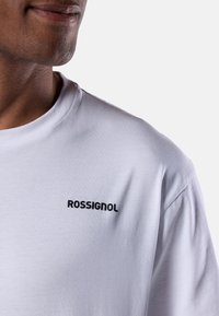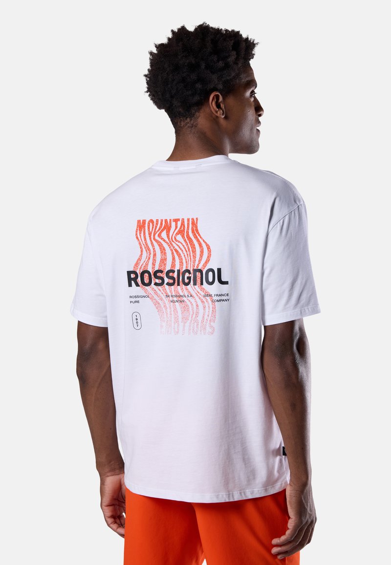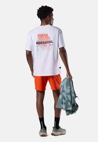 Man die een wit Rossignol T-shirt draagt met een rood-zwarte bergthema tekstgrafiek op de achterkant, gecombineerd met feloranje korte broek.