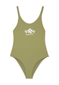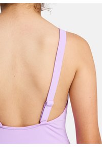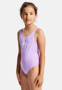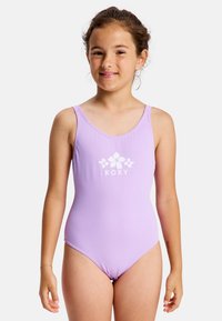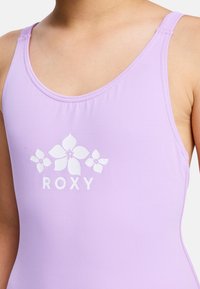 Lila badpak met een witte Roxy-logo en bloemmotief, gemaakt van gladde stof, met brede banden en een klassieke snit.
