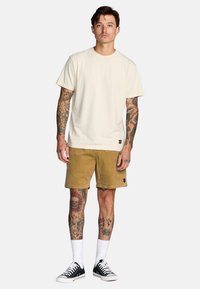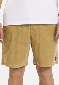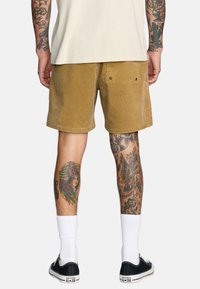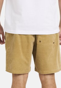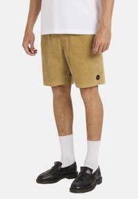 Tan ribfluwelen shorts met een relaxte pasvorm, voorzien van een rechte zoom en een klein logoplaatje. Gecombineerd met zwarte sneakers en witte sneakersokken.