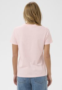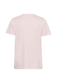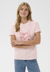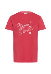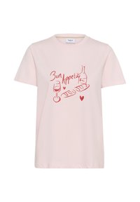 Vrouw met blond haar die een roze T-shirt draagt met rode opdruk "Bon Appetit" en tekeningen van een wijnglas, fles en stokbrood, gecombineerd met een blauwe jeans.