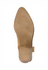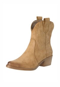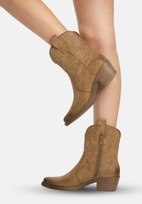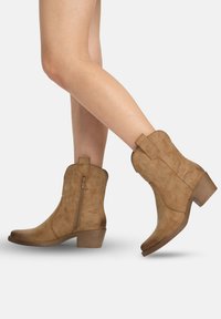 Benen met mid-kuit beige suède laarzen in westernstijl met zijritsen, lage blokhakken en decoratieve stiksels op een witte achtergrond.