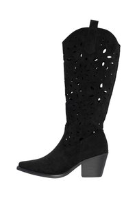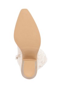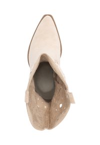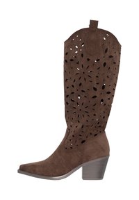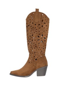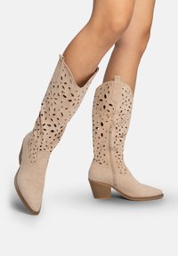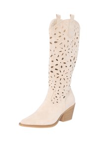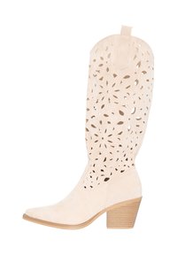 Benen met beige kniehoge laarzen met bloemvormige uitsnijdingen, een ritssluiting aan de zijkant, aantreklussen en gestapelde lage hakken op een neutrale achtergrond.