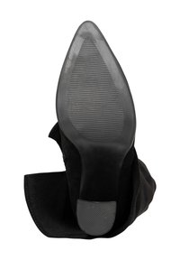 Zwarte suède kniehoge laarzen met een chunky hak, voorzien van een zijrits en een opgevouwde manchetaccent met een metalen detail.