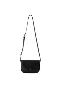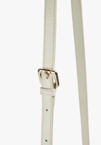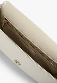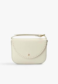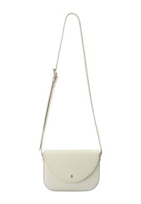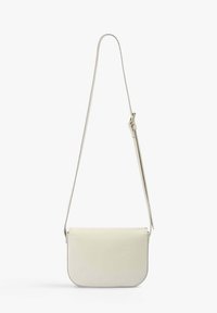 Kleine witte schoudertas met geschulpte klep en verstelbare band, minimalistisch ontwerp, zonder zichtbare merknaam of patronen.