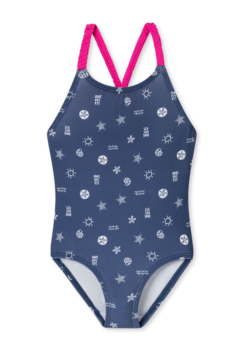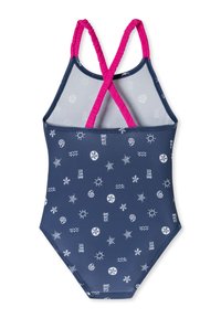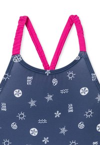Marineblauw badpak met witte patronen van zon, golven en bloemen. Voorzien van gekruiste roze bandjes en een gladde stretchstof.