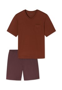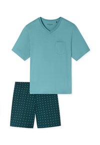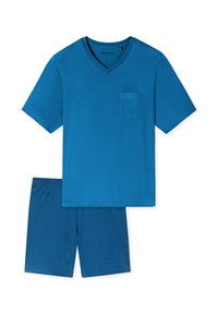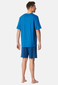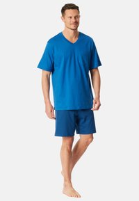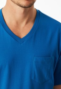 Blauw katoenen T-shirt met V-hals en een zakje, gecombineerd met blauwe korte broek met patroon. De korte broek heeft een losse pasvorm en ademende stof, geschikt als loungewear.