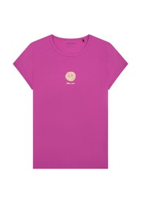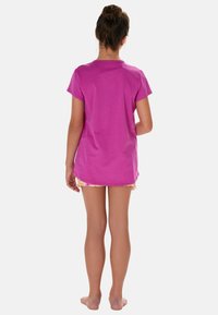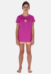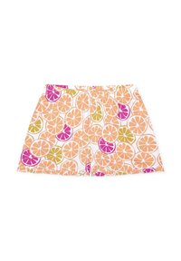 Jong meisje staat op blote voeten, draagt een paarse T-shirt met een afbeelding van een sinaasappelschijfje en oranje geruite korte broek, tegen een witte achtergrond.