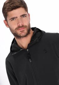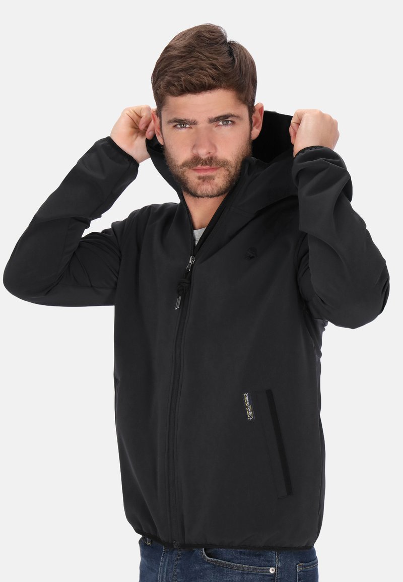 Zwarte jas met ritssluiting en capuchon, met een zachte stoftextuur, zijzakken en een verstelbaar trekkoord. Eenvoudig en modern ontwerp.